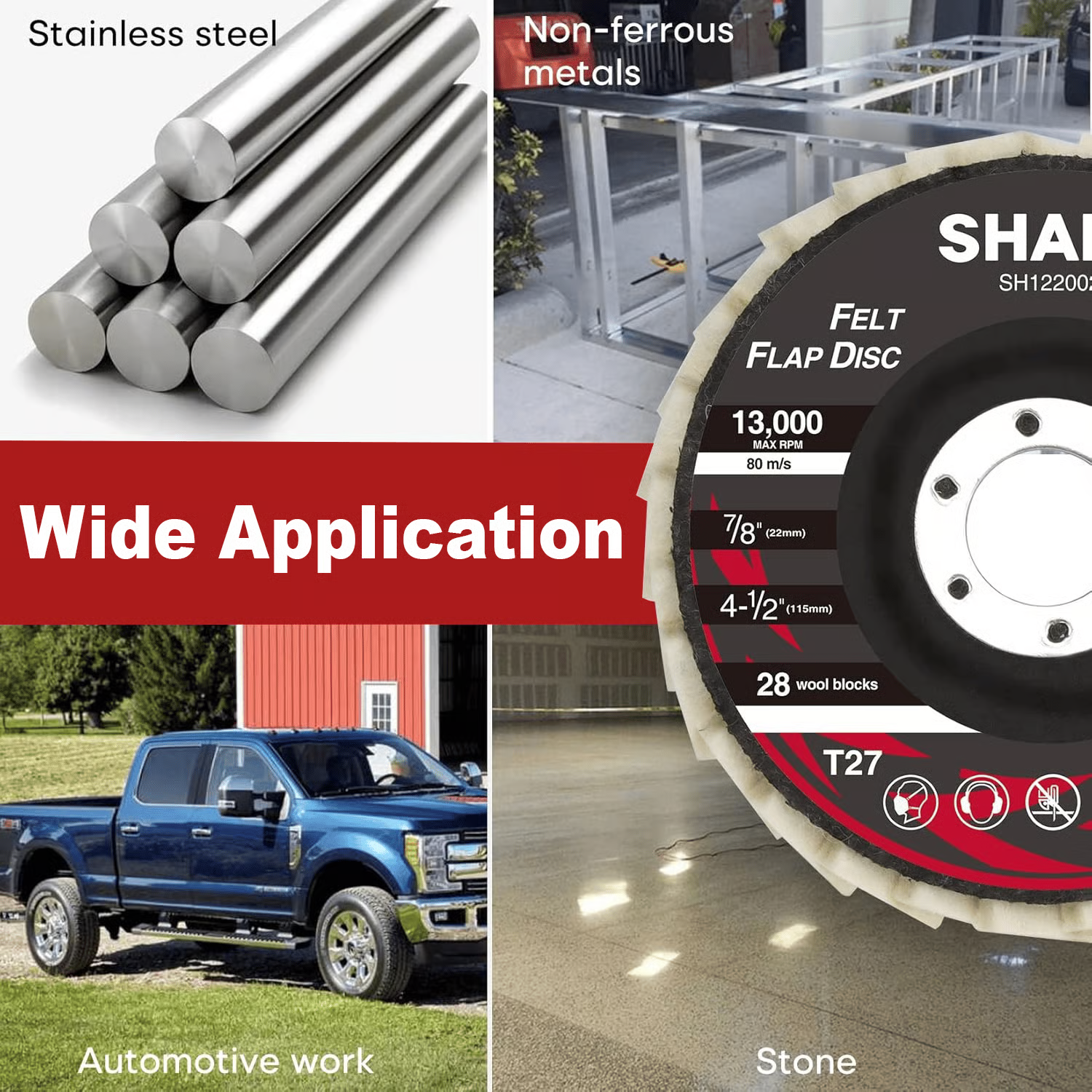 🎯Features a sturdy fiberglass backing plate that withstands high pressure and absorbs vibration. Premium wool pads deliver finer polishing and longer life. Gaps between pads allow for better heat dissipation. Ideal for stainless steel, aluminum, and non-ferrous metals. These wheels ensure balanced, smooth polishing—making it easy to achieve professional-grade results! 🔥